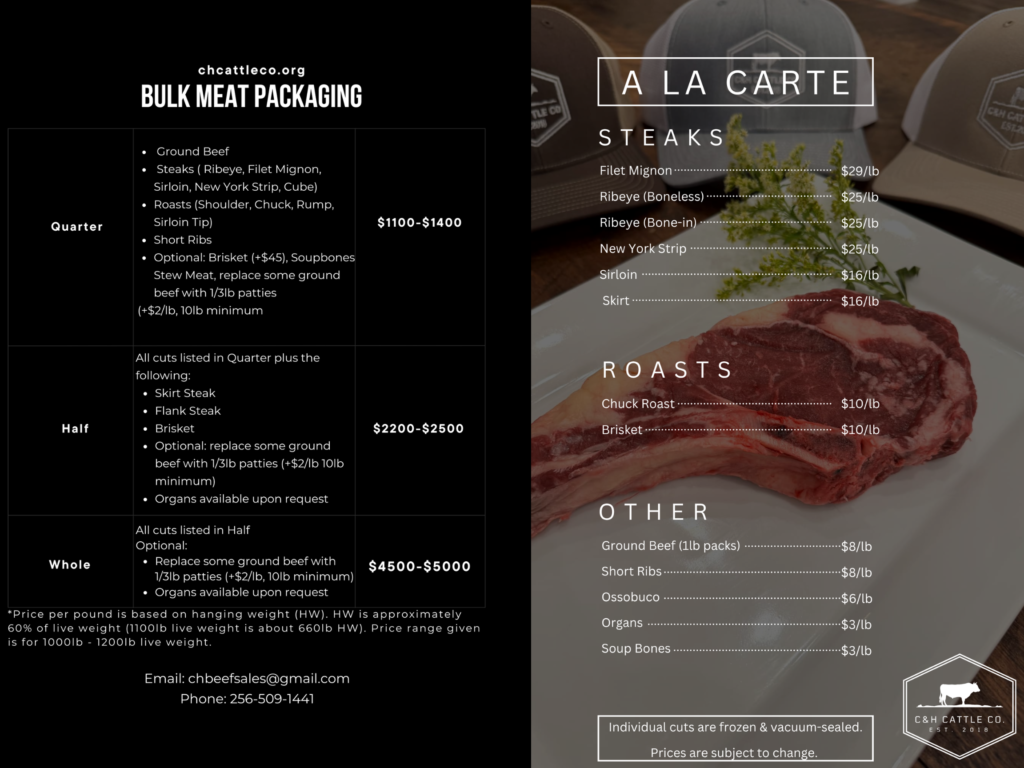 For bulk packages and ala cart sales send us an email including what you would like to order and any preferences you may have. We will review your cut sheet and respond with a deposit. Upon a bulk order, we require a $300 deposit, the invoice will be sent along with your order confirmation email. You can pay the deposit online through the given link. The $300 will be taken off of the total. The total can be paid online or upon pickup. We will let you know when your order is available for pickup at our farm in Hazel Green, Alabama. The time frame for bulk packaging will vary but we will gladly give an estimated time frame before ordering. Ala Cart Options , as long as we have them in stock can be picked up within the week. A whole includes around 350 pounds of meat, 175 pounds in a half, 80 pounds in a quarter.
